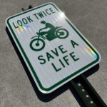 ”LOOK TWICE SAVE A LIFE"はアメリカで行われている交通安全キャンペーンに使用されているフレーズ。バイカーのような交通弱者の安全を守るために、自動車ドライバーに注意を促す看板です。曲がる時などに二回確認して巻き込み事故を防ぐ事が目的です。