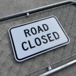 通行止めになっている道路の入口に設置される看板です。アメリカではオレンジと白のゼブラ柄リフレクターの貼られた板のバリケードに設置されます。