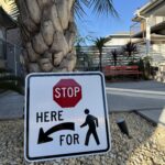 この看板がある場所で歩行者が待っている場合は、車は停止線で停止しなくてはいけません。この看板はアメリカの一部の地域で交通事故を防ぐためにLocal Law(地方自治体の法律)やState Law(州の法律)で設置されている看板です。